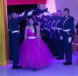Como parte de la tradición de esta celebración, las adolescentes ingresaron a la fiesta mediante la formación de un arco de espadas, a cargo de  los  cadetes de la Policía Nacional del Perú.