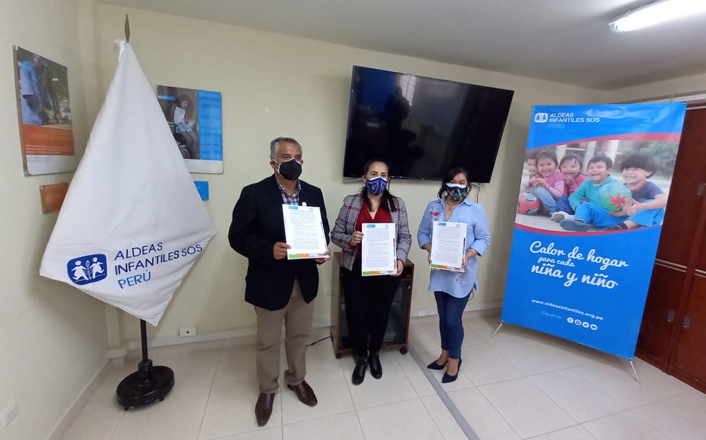 En la firma de la alianza participaron Nancy Martínez, Directora Nacional de Aldeas Infantiles SOS Perú; Jhony Noa, Director de Desarrollo Programático de Aldeas Infantiles SOS Perú; Gorki Tudela, Director de Planeamiento Estratégico de Aldeas Infantiles SOS Perú; Jacqueline Arribasplata, Directora de Aldeas Infantiles SOS Perú Programa Cajamarca; y Luis Alberto Llaque Silva, Director de la Unidad de Gestión Local – UGEL Cajamarca.