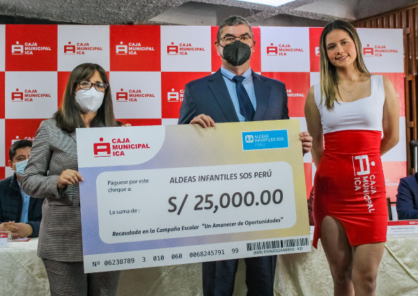 Tras alcanzar el objetivo de la campaña escolar “Un Amanecer de Oportunidades”, Caja Ica donó S/25 000 para contribuir con la labor de atención y protección de cerca de 20 000 niñas, niños y adolescentes que realiza nuestra organización.