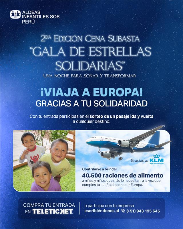 El jueves 14 de agosto, en Aldeas Infantiles SOS Perú llevaremos a cabo la segunda edición de nuestra cena subasta “Gala de Estrellas Solidarias”, que busca recaudar fondos para entregar 40,500 raciones de alimentación balanceada a niñas, niños y adolescentes en situación de vulnerabilidad en nuestro país.